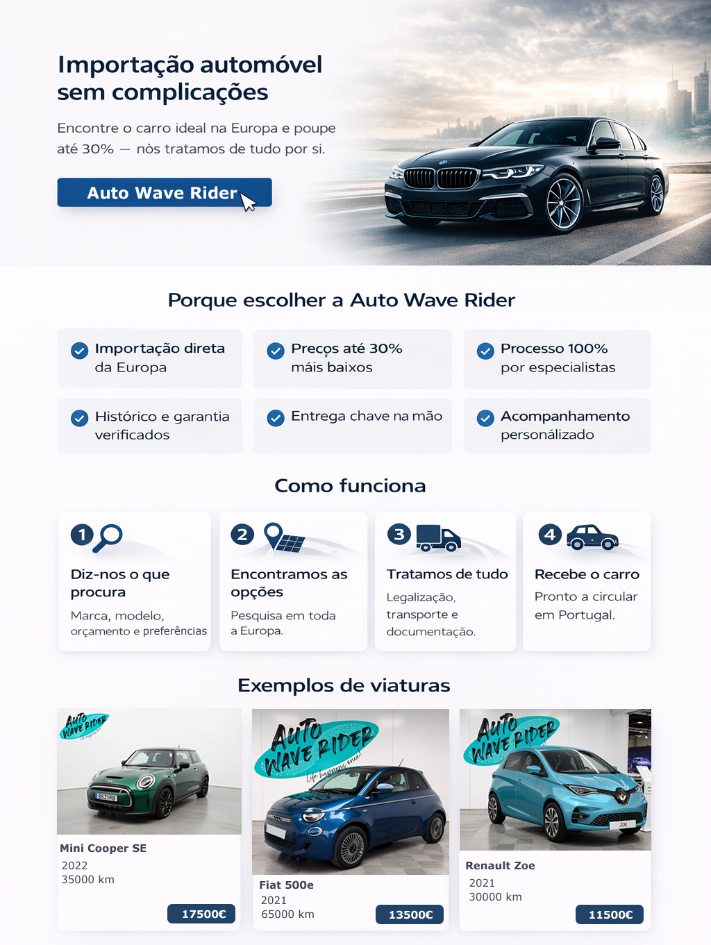 Na Auto Wave Rider, transformamos o processo de importação automóvel numa experiência simples, segura e totalmente personalizada.